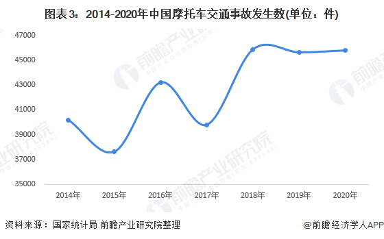 近几年,国家从法规和监管上都加强了对摩托车骑乘人员和销售厂家的监管,从源头和过程中减少了交通事故发生的可能性。伴随着新增摩托车数量的不断增加,我国摩托车交通事故发生数量并没有出现明显的大幅增长。根据国家统计局数据显示,2014年到2020年我国摩托车交通事故发生数量仅呈现小幅波动增长态势。2014年,全国摩托车交通事故发生次数为40185件,2018年达到45868件,达近几年新高。2019年和2020年,尽管新登记注册摩托车数量出现大幅增长,但在国家新国标政策以及严苛的交通安全管理下,摩托车交通事故发生数量并没有出现大幅增长,而是保持在45000件左右。