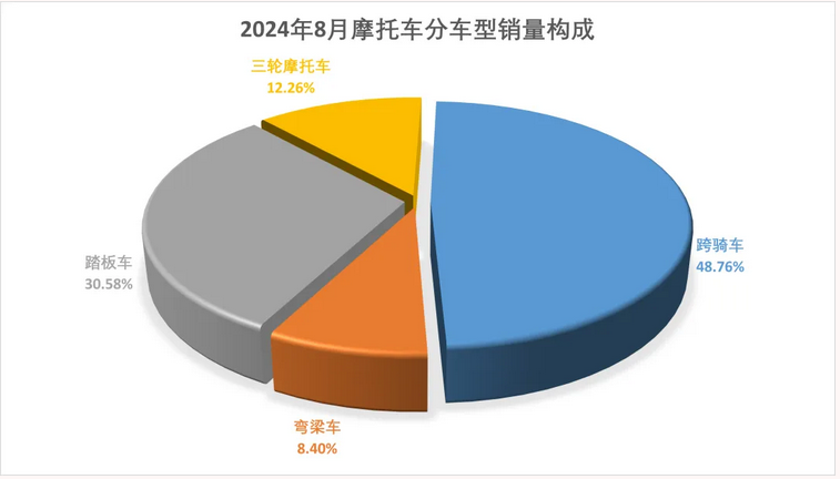 1-8月,跨骑车产销643.1万辆和638.25万辆,同比增长21.11%和19.3%;踏板车产销393.84万辆和400.24万辆,同比下降30.58%和23.93%;弯梁车产销112.23万辆和109.95万辆,同比增长5.15%和2.68%。从各车型销量占二轮车总销量的比重看,跨骑、踏板和弯梁三类车型占比分别为55.58%、34.85%和9.57%。